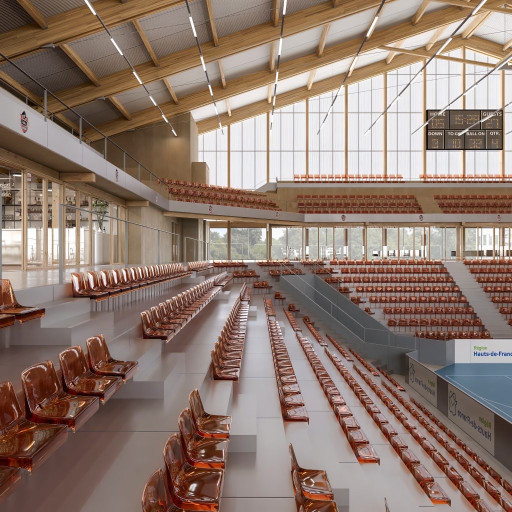 Statut Concours _Programme Salle Polyvalente à Gravelines _Maître d’ouvrage Ville de Gravelines _Surfaces 7.630 m² – 3000 places _Architectes AZC Paris _Environnement RE2020