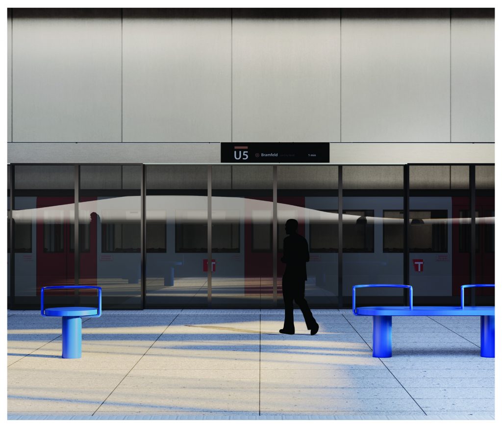 Statut Projet en cours _Programme Nouvelle station de métro sur la ligne U5 à Hambourg _Maître d’ouvrage Hamburger Hochbahn _Surfaces Voyageurs 5.834 m², techniques 2.250 m² _Architectes AZC Paris + BLRM Hambourg _Equipe TREIBHAUS Landschaftsarchitektur Hambourg, paysagiste, Knippershelbig Berlin, BET structure, ANDRES + PARTNER concepteur lumière